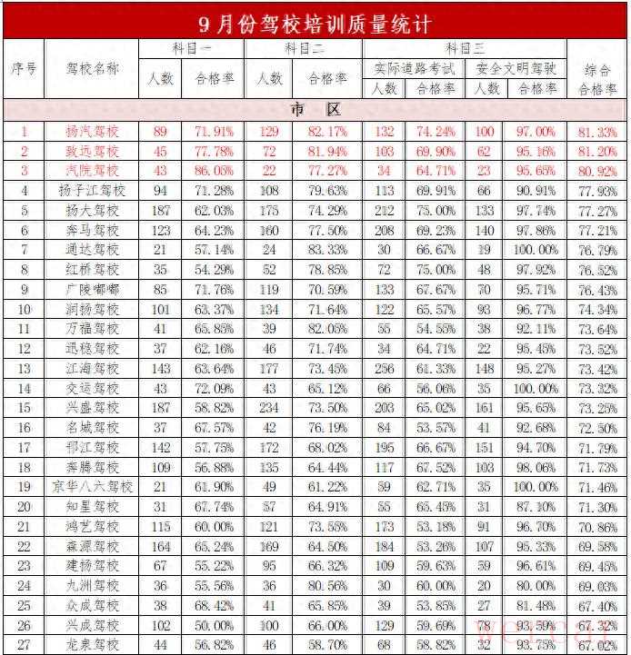 9月份全市62家驾培机构单科排名前三的驾校是:科目一理论考试:汽院驾校(86.05%)、致远驾校(77.78%)、荷乡驾校(73.02%);科目二场地技能考试:兴达驾校(87.10%)、通达驾校(83.33%)、扬汽驾校(82.17%);科目三实际道路:东方驾校(79.17%)、英翔驾校(78.16%)、新世纪驾校(76.00%)。