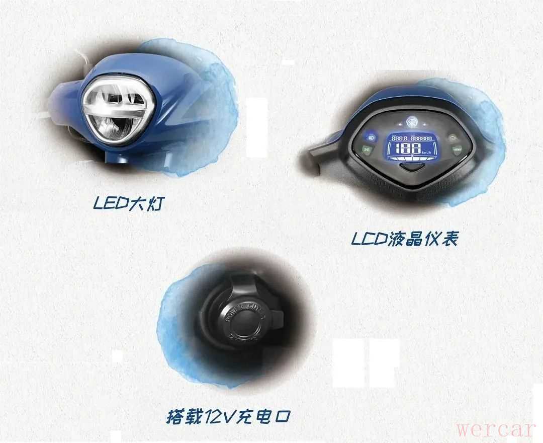 配置方面,全段式防烫排气护罩、前置开放式储物盒、17升容量座桶储物空间、代替老款机械指针式仪表换成了LED的液晶屏,其中仪表带有ECO指示灯,可惜的是,没有独立显示的转向灯提示灯。增加了12V的充电接口,实用性得到提升。