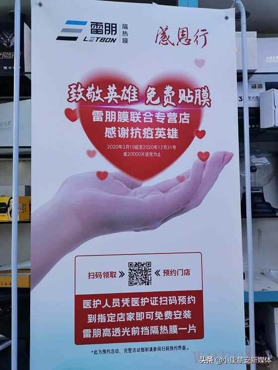 温馨提醒:创新科技,引领时尚;致敬英雄,慈善先行。雷朋膜联合专营店感恩抗疫英雄,即日起,至2020年12月31日,医护人员凭医护证件扫码预约就可到指定店家免费安装雷朋高透光前挡隔热膜一片(或2万片送完为止)。