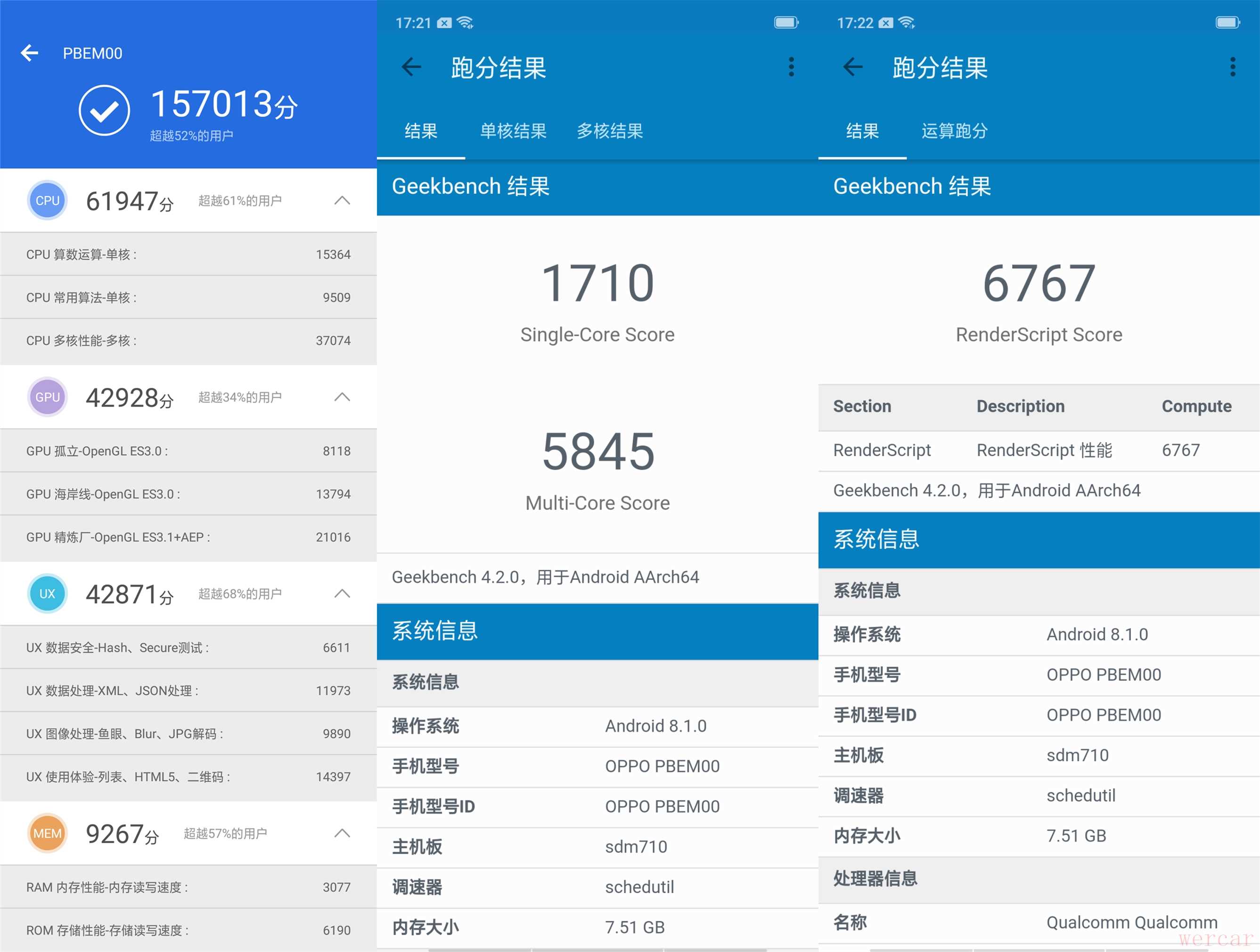 根据实际跑分,OPPO R17安兔兔跑分成绩为157013分,Geekbench单核心成绩1710分,多核心5845分,运算成绩为6767分。相比R15,GPU成绩提升明显。