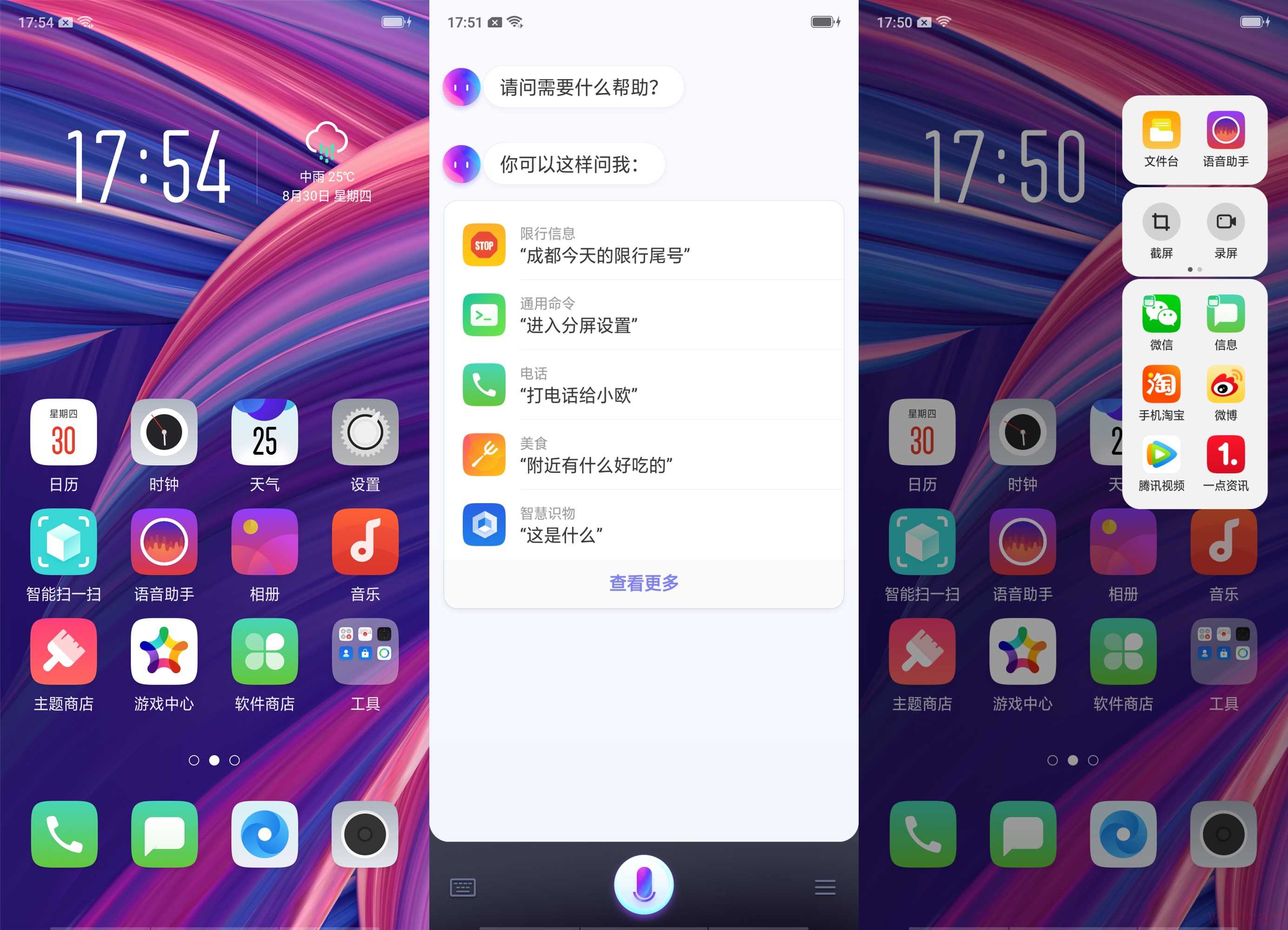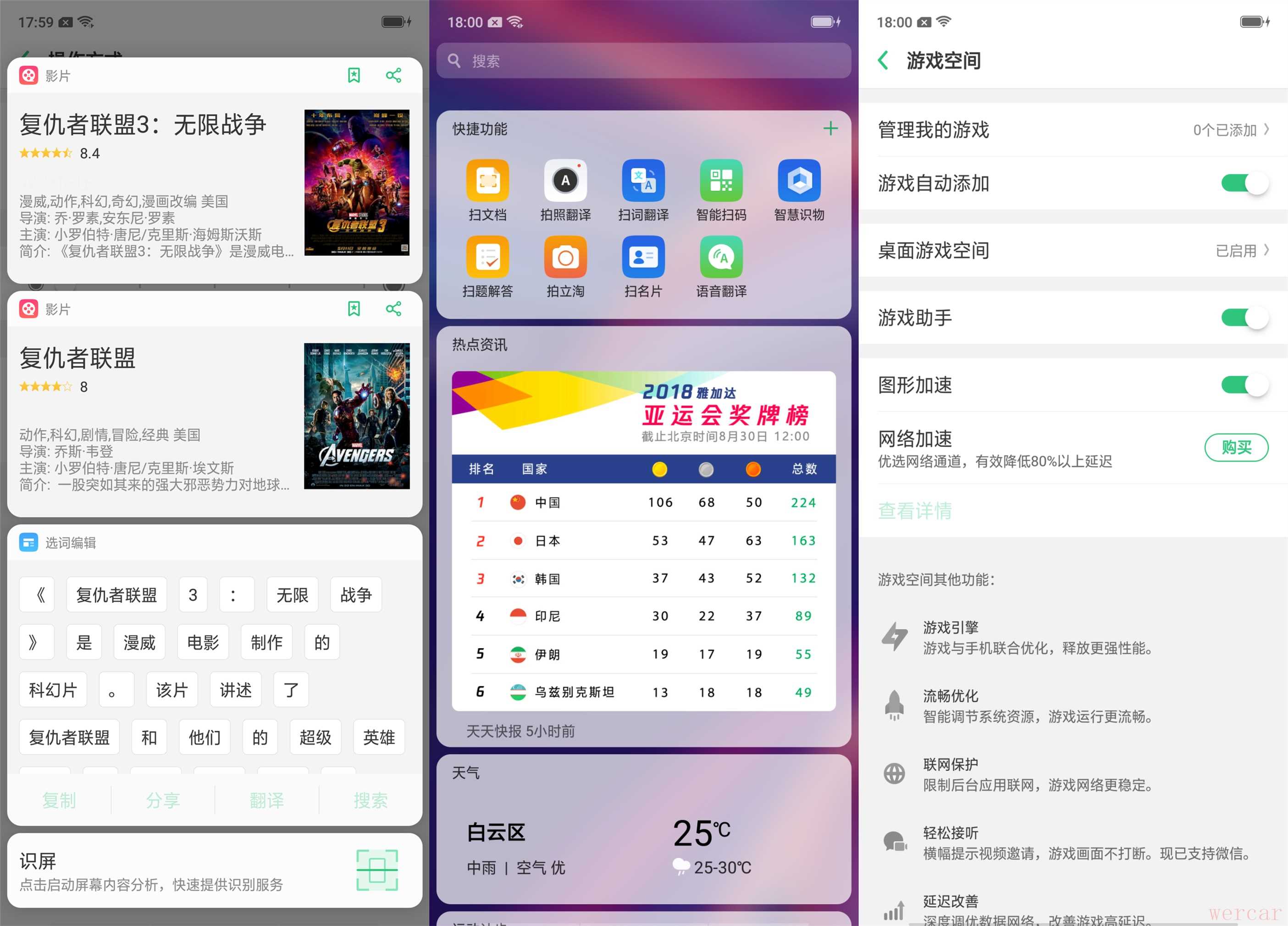 不仅如此,ColorOS 5.2还有智慧识屏、AI智能助手、游戏空间等功能。智慧视屏可通过按压文字来分析和识别,并能实现类似于大爆炸的分词功能。AI智能助手位于主界面负一屏,提供快捷功能、资讯、天气等入口。游戏空间可实现图形网络加速、游戏优化等,并提供游戏助手功能。