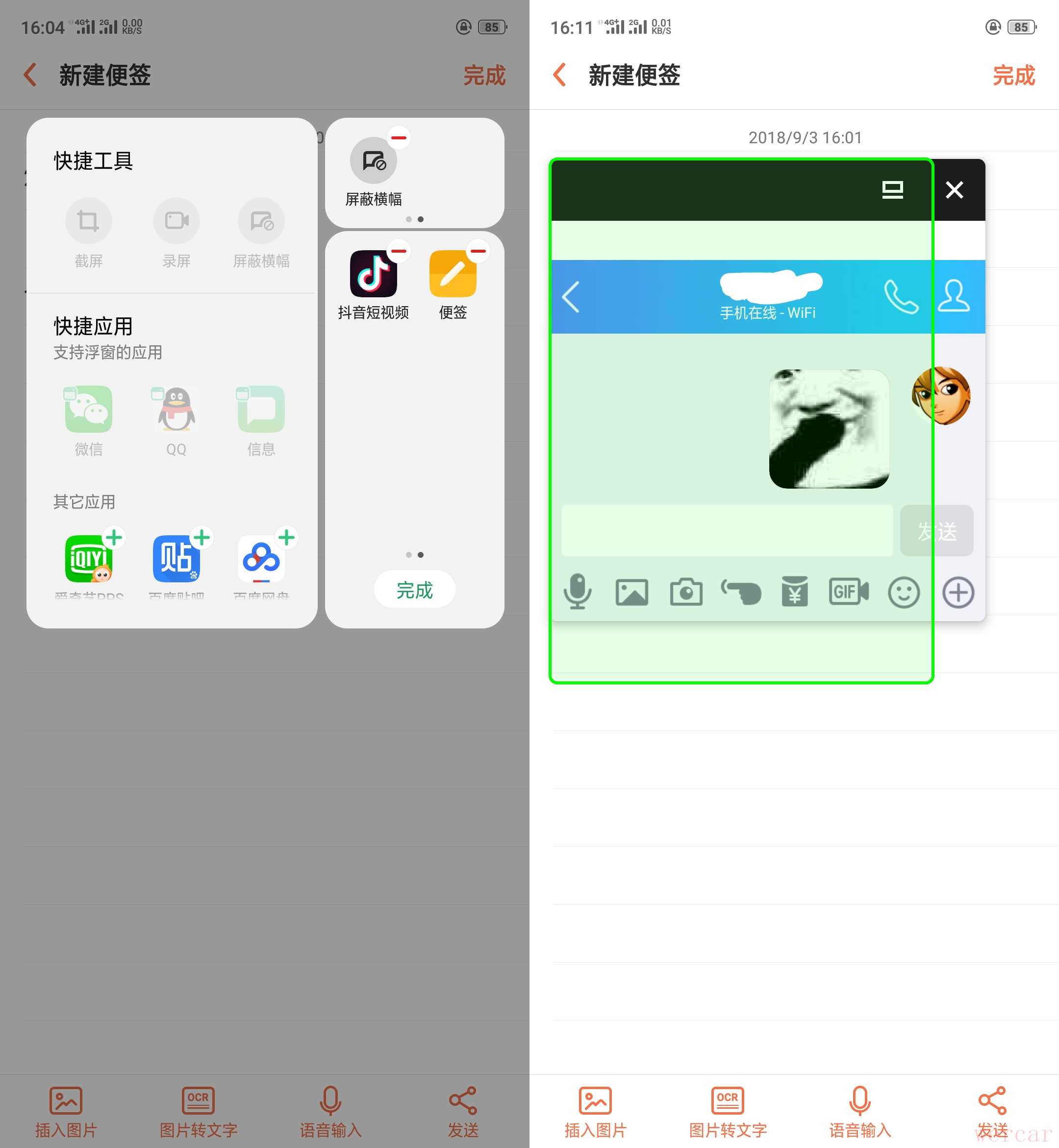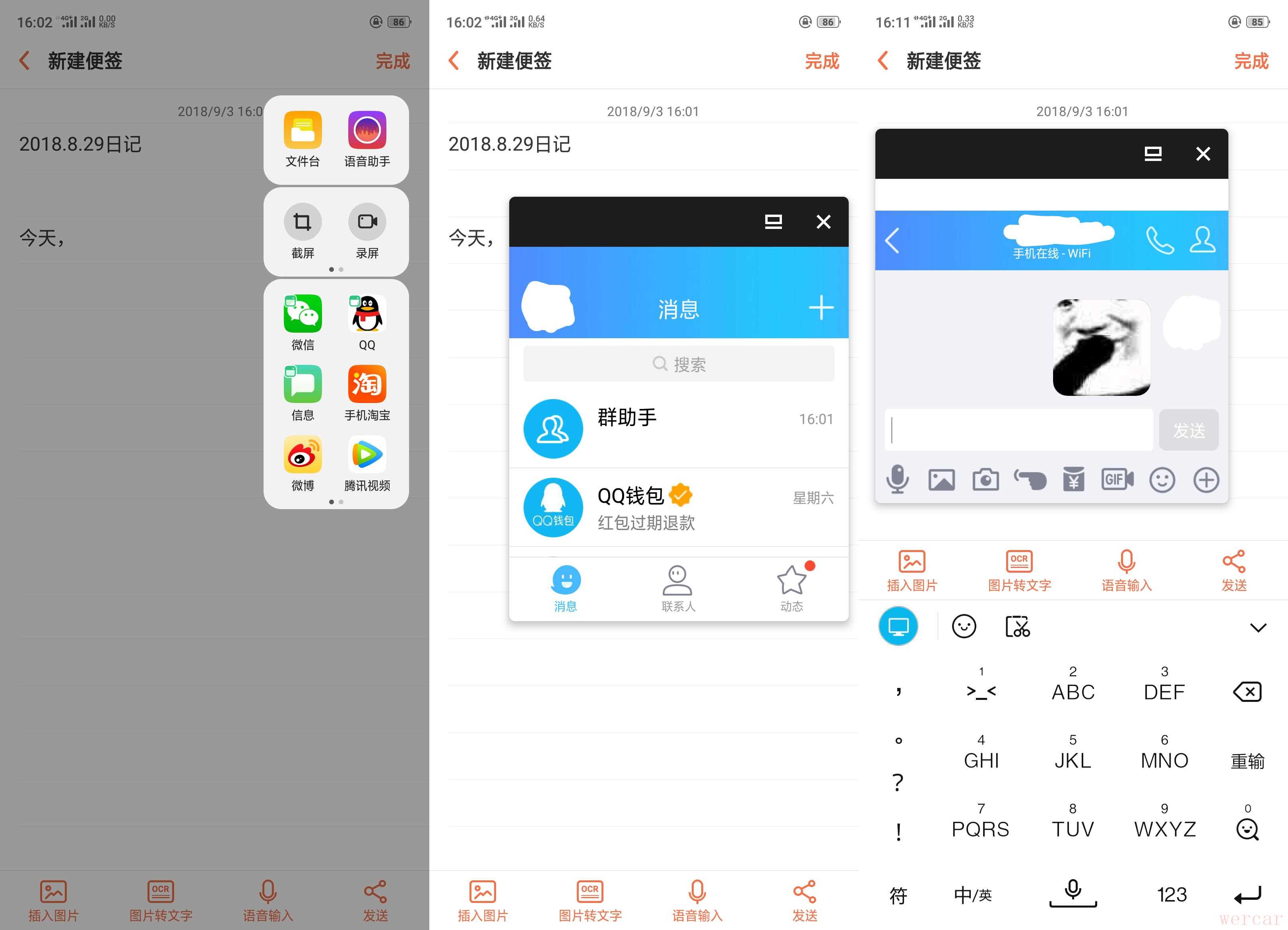 智能侧边栏支持添加移除应用功能,但目前仅微信、QQ以及短信支持悬浮显示,其余应用点击只会快速切换。此外,支持悬浮显示的应用程序可以根据需求调整大小,更加符合用户的使用习惯。