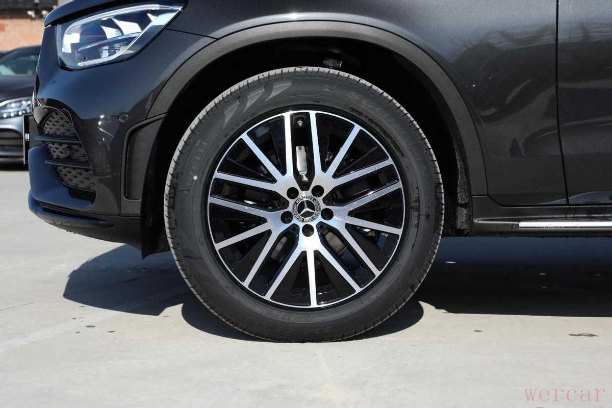 来到车身侧面,奔驰GLC轿跑车身长宽高分别为4731/1898/1606mm,轴距为2873mm。车身腰线设计较为简单,采用上下分层设计,使整台车看起来更有肌肉感。轮毂为多条辐结构,前后轮胎规格为235/55 R19,结合车身尺寸参数来看,与车身的匹配较为合适。