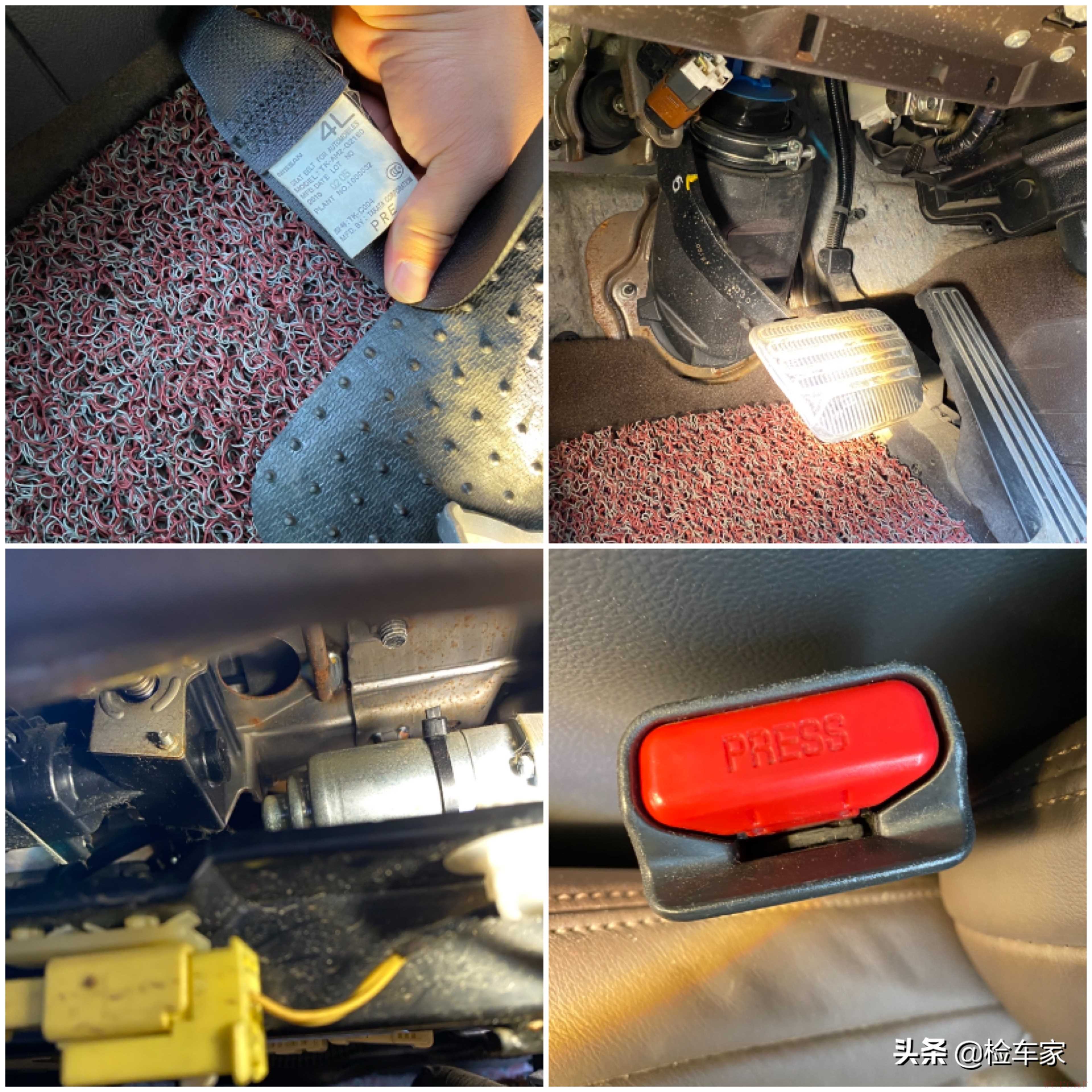 安全带生产日期在车辆出厂周期范围内,螺丝没有拆卸痕迹;方向盘管柱无生锈;刹车和油门踏板没有明显磨损发亮;座椅骨架无生锈,地板无腐蚀发霉,安全带卡扣内无泥沙。