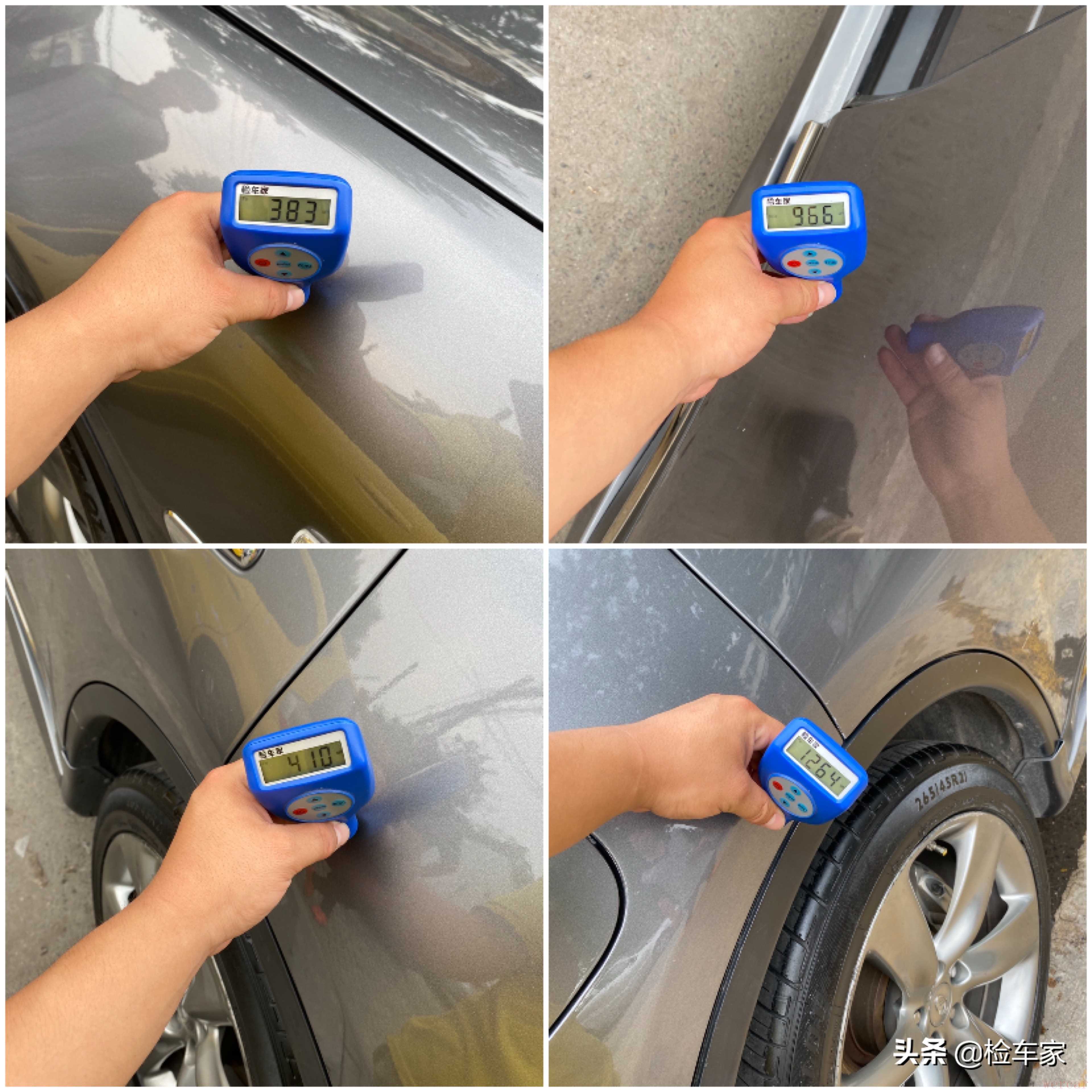 这台车是改过色的,由原来的棕色改成了灰色,所以全车都存在喷漆的情况,就不给大家一一上图了。下面把重点放在有钣金修复的地方,首先来看车身左侧。左前叶子板钣金,左后门钣金,左后叶子板钣金,右后叶子板钣金,都是小磕碰剐蹭造成的,覆盖件钣金并不影响正常使用。