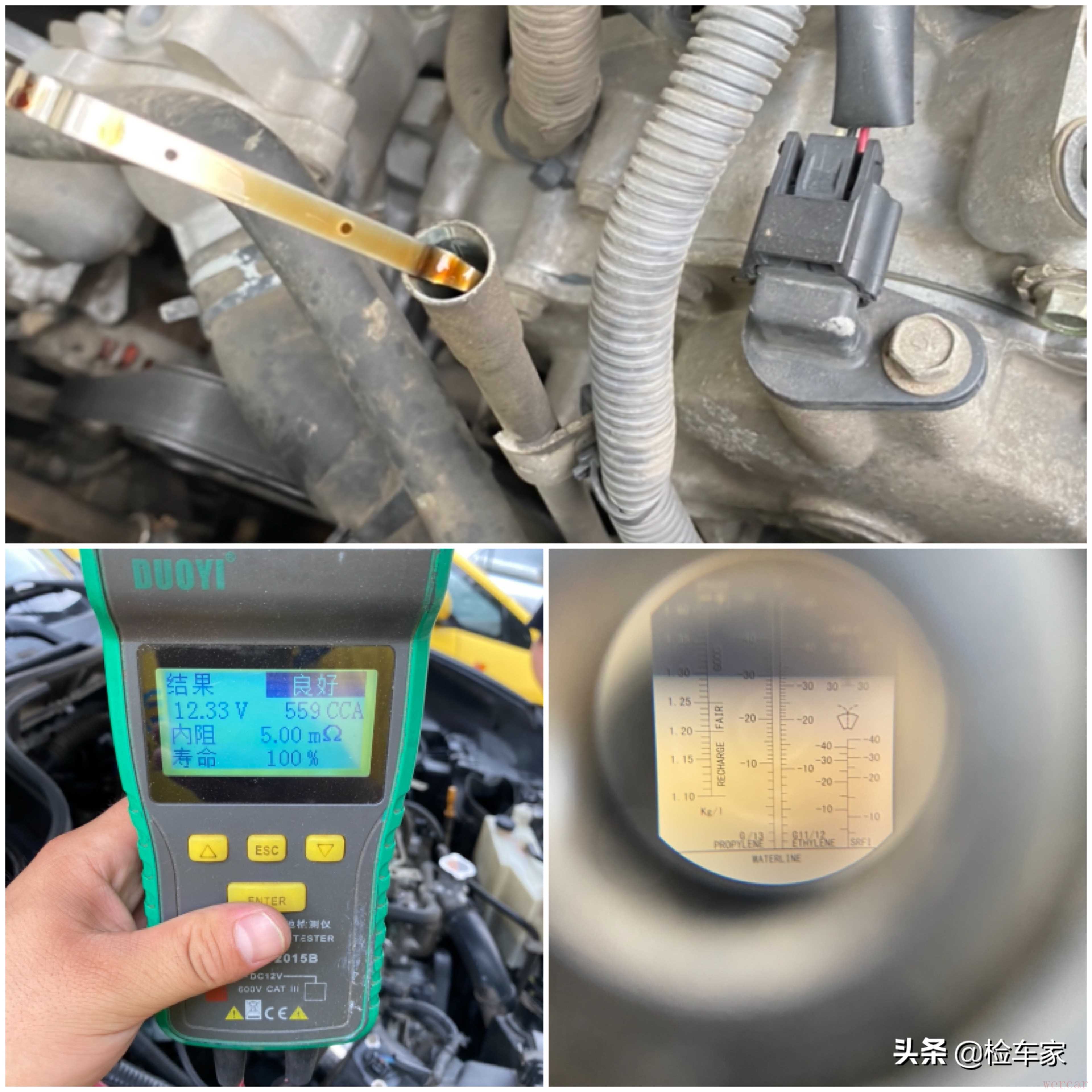 随后检查全车油液,机油还挺干净的,看成色发动机之前保养的还不错;电瓶寿命百分之百,应该刚做过更换没多久;防冻液冰点指数达标;油液和电瓶暂时都不需要更换,可以节省一大笔保养费用。