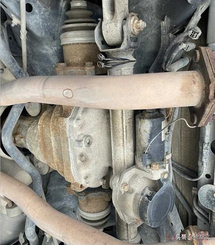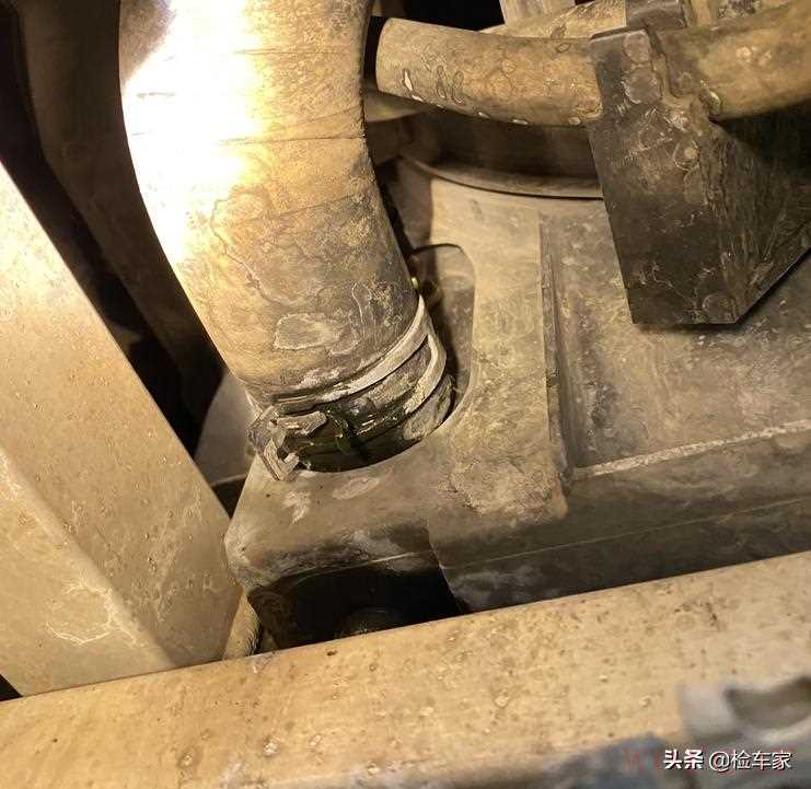 水箱下水管接口处渗漏防冻液,换了水箱却没把水管卡子装到原来的位置,这就很容易漏液。铁头我之前修车时底下的学徒工经常干这事,不过不是什么大问题,把水管卡子重新卡到原来位置即可。底部前部纵梁周围结构件无碰撞修复。