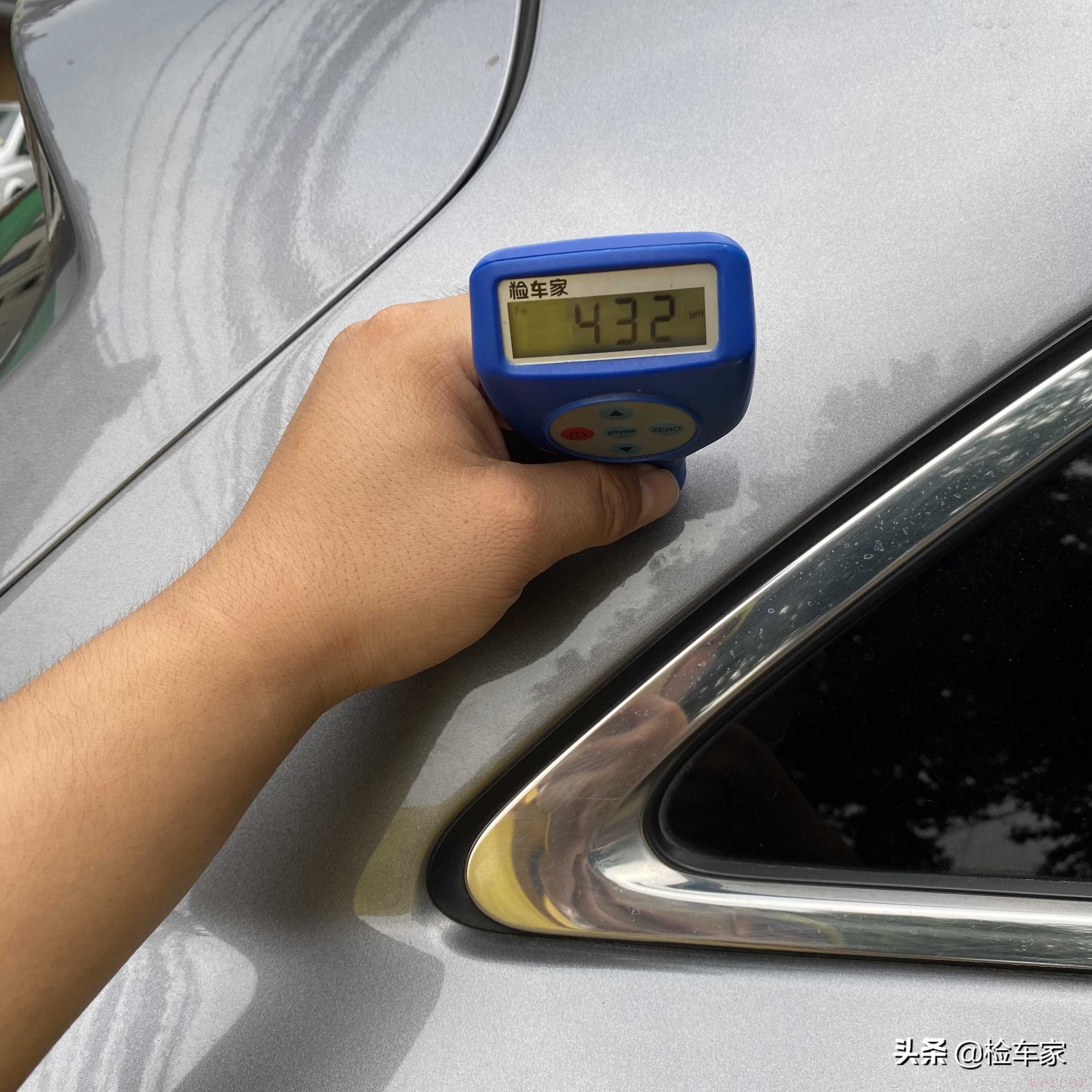 检测到右C柱时发现漆面数值从300跳到400,车辆多次补漆漆面数值高也很正常,但是跟周围的漆面数值比起来400多就属于小钣金了,详细检查C柱内侧排除了焊接切割的情况。小钣金虽然不影响安全使用,但按照事故车的认定标准,车身结构是不能有任何损伤的。严格来说这个问题对于车辆正常使用影响不大,但我一定要向客户说明。