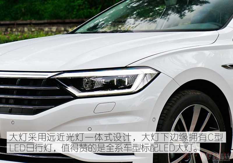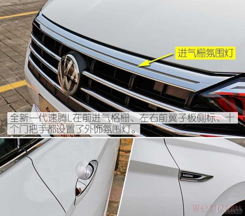 速腾是全球首款采用外饰氛围灯的车型,侧标发光logo、门把手亮灯还有外后视镜投地灯这些东西实际上在其他车型也曾出现过,但前进气格栅氛围灯算是第一次听说。实际上这进气格栅氛围灯就是在中网上的一根灯带,在白天它并不会亮起,晚上就可以看到点亮效果。