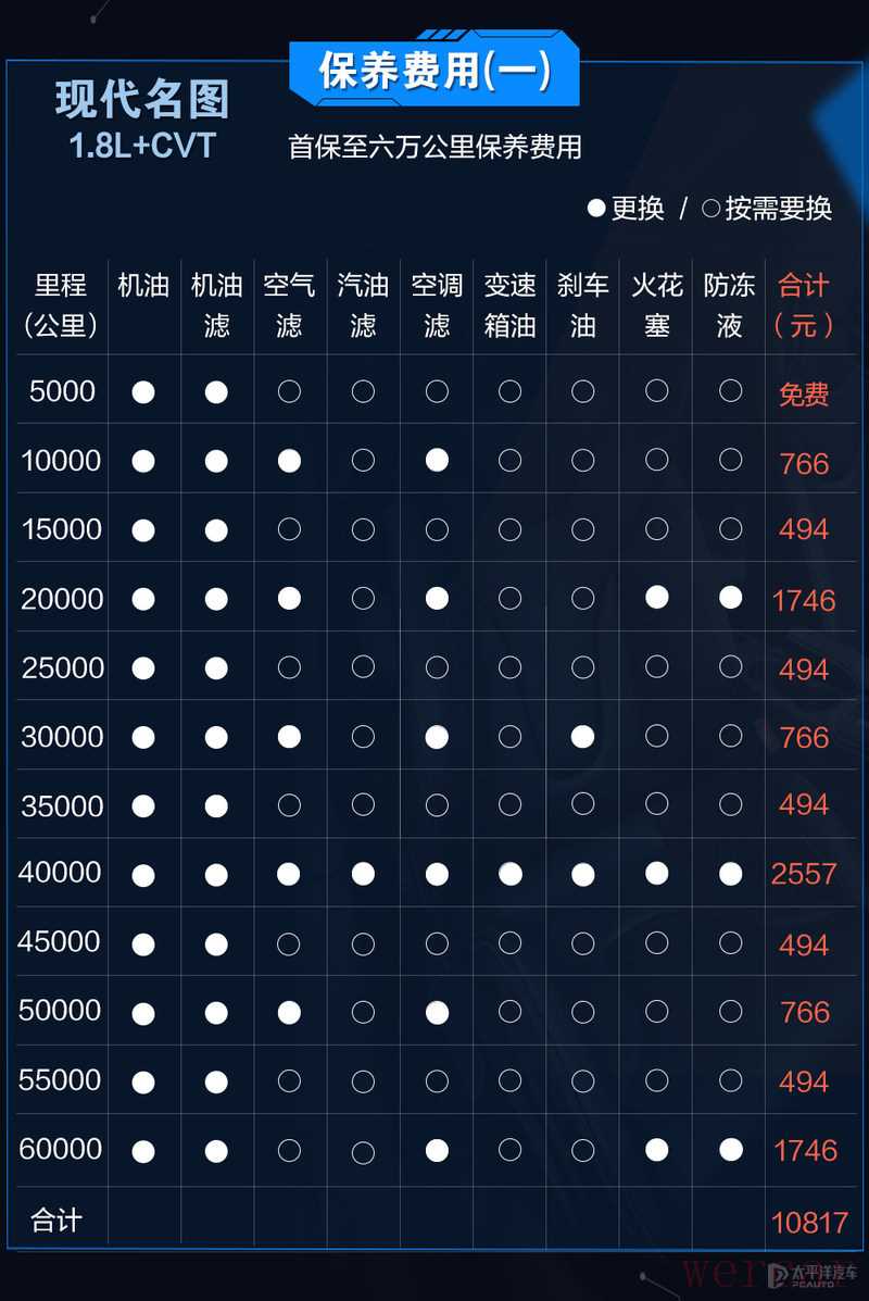 名图1.8L车型单次小保养不足500块钱,但保养间隔为5000公里,6万公里下来总保养费用为10817元。而速腾的保养间隔在10000km,单次小保养价格在500元出头,即使是6万公里保养下来的总花费也才6162元,要比名图经济实惠不少。