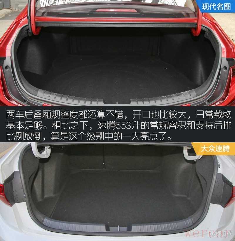 后备厢容积上,车长占优的名图数据居然不如速腾,着实有点让人意外。此外,名图并不支持后排座椅放倒,在储物灵活性上,速腾同样更有优势。如果你经常出远门,或者经常需要后备厢载物的话,速腾的实用性会更强。