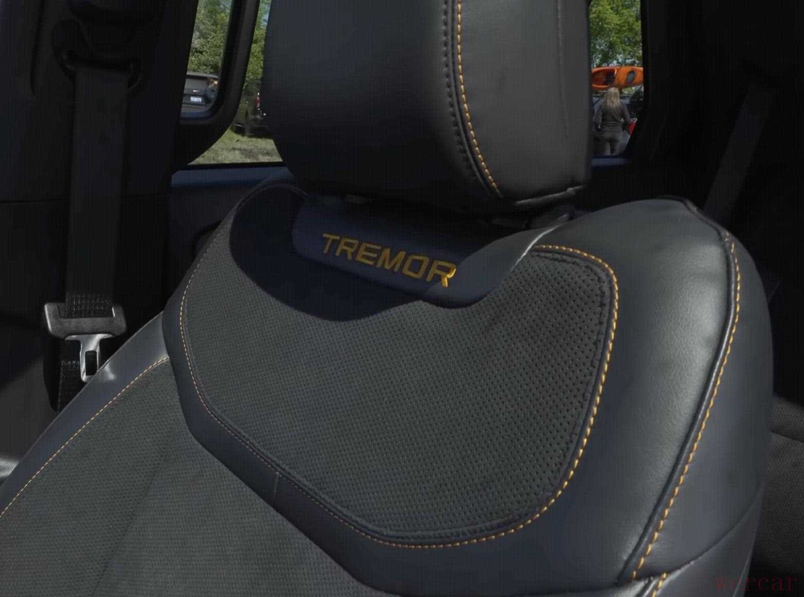 "内饰:" 内饰方面,Tremor通常采用更粗犷的风格,例如采用岩灰色或沙岩色的织物/混合材质座椅,并带有独特的纹理或缝线。中控台、门板等处也可能有"Tremor"标识或专属饰条。方向盘、换挡杆等也可能采用皮革或仿皮革包裹,并带有特殊纹理。