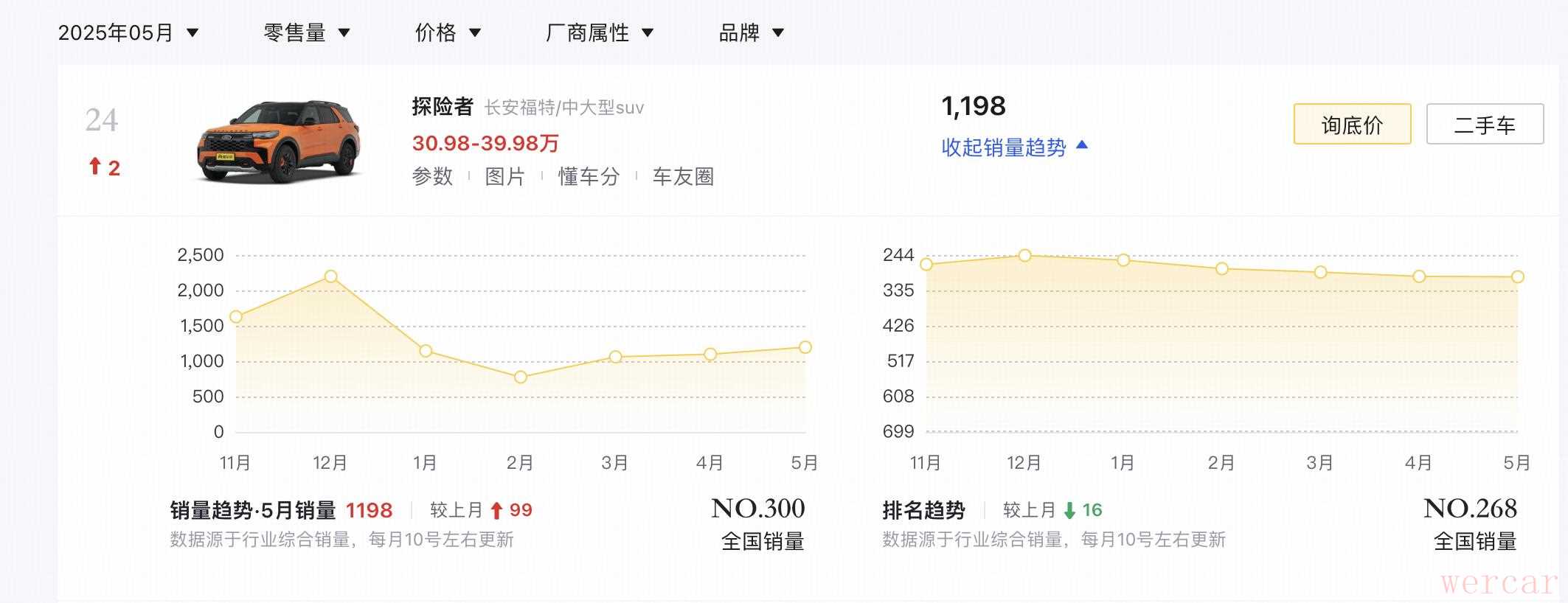根据车型级别来看,探险者同级车型有大众途昂(指导价格区间为24.9万-38.90万元)、日产探陆(指导价格区间为23.98万-30.18万元)等。根据销量数据显示,2025年5月,探险者销量为1198辆,销量在该级别排名第24位。更多消息,懂车帝将持续关注。