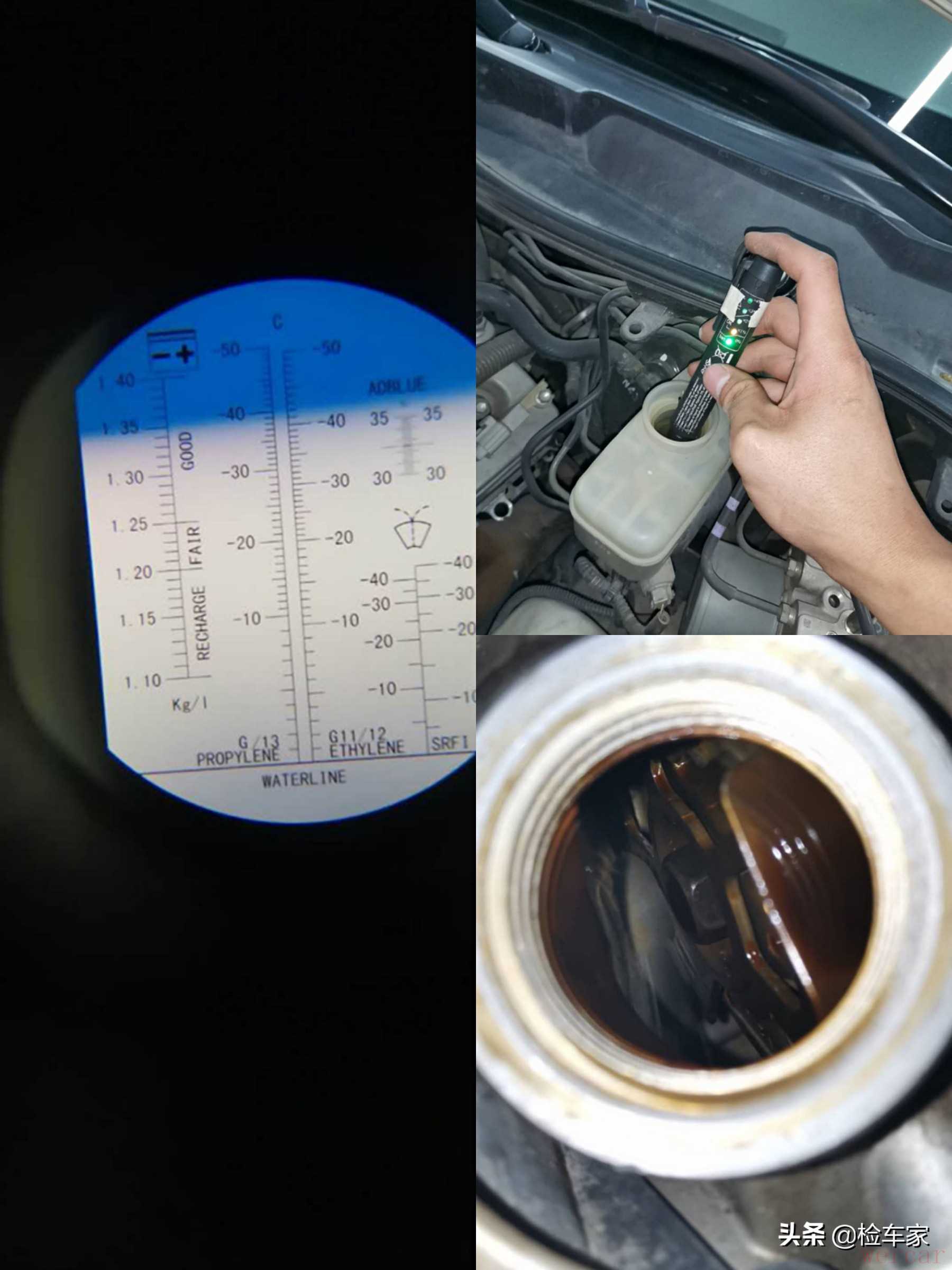 油水这方面没有问题,防冻液冰点在正常范围之内,但刹车油含水量偏高两个点,再用一段时间也需要更换了,发动机内部干净,看来原车主还是挺爱惜车的。