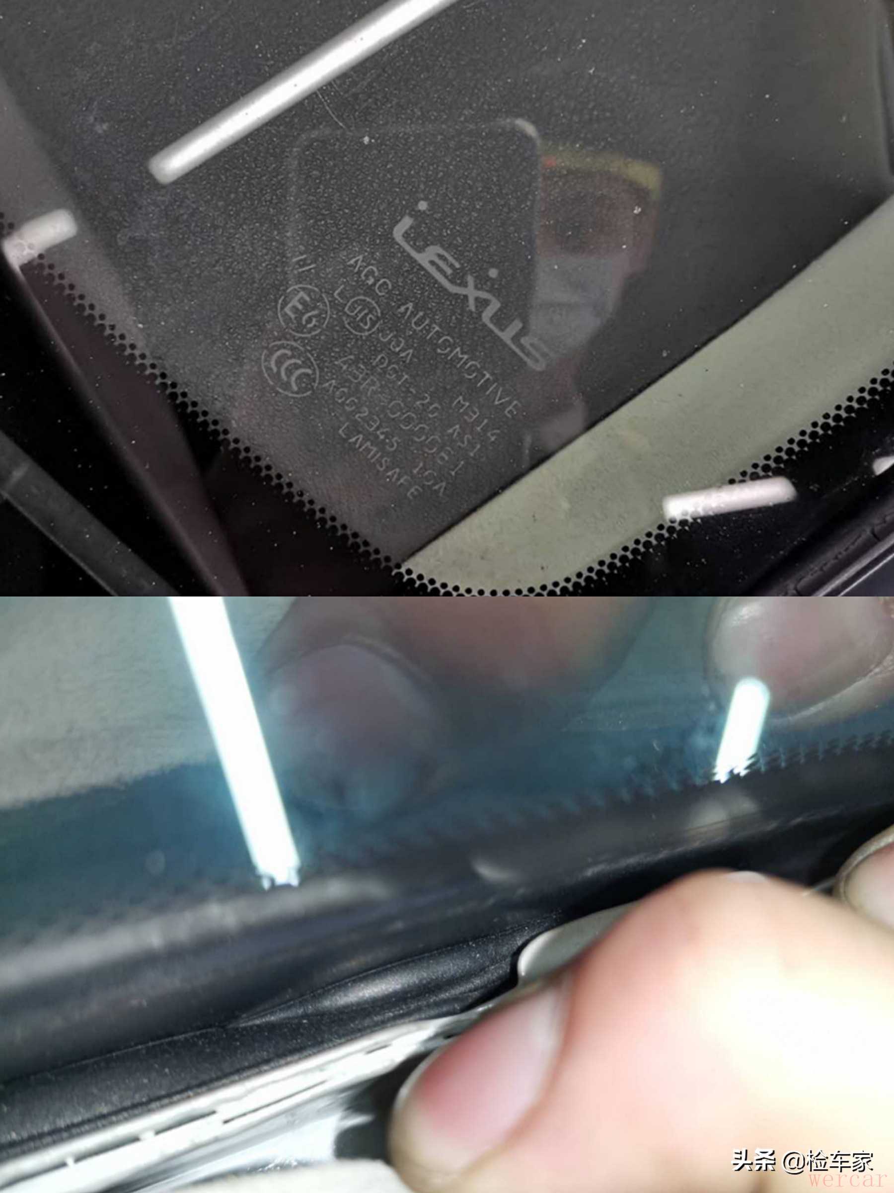 前挡风玻璃更换,前挡风玻璃型号与全车玻璃型号均不一致,里面有明显后期打胶的痕迹,可以确定前挡风玻璃有过更换。