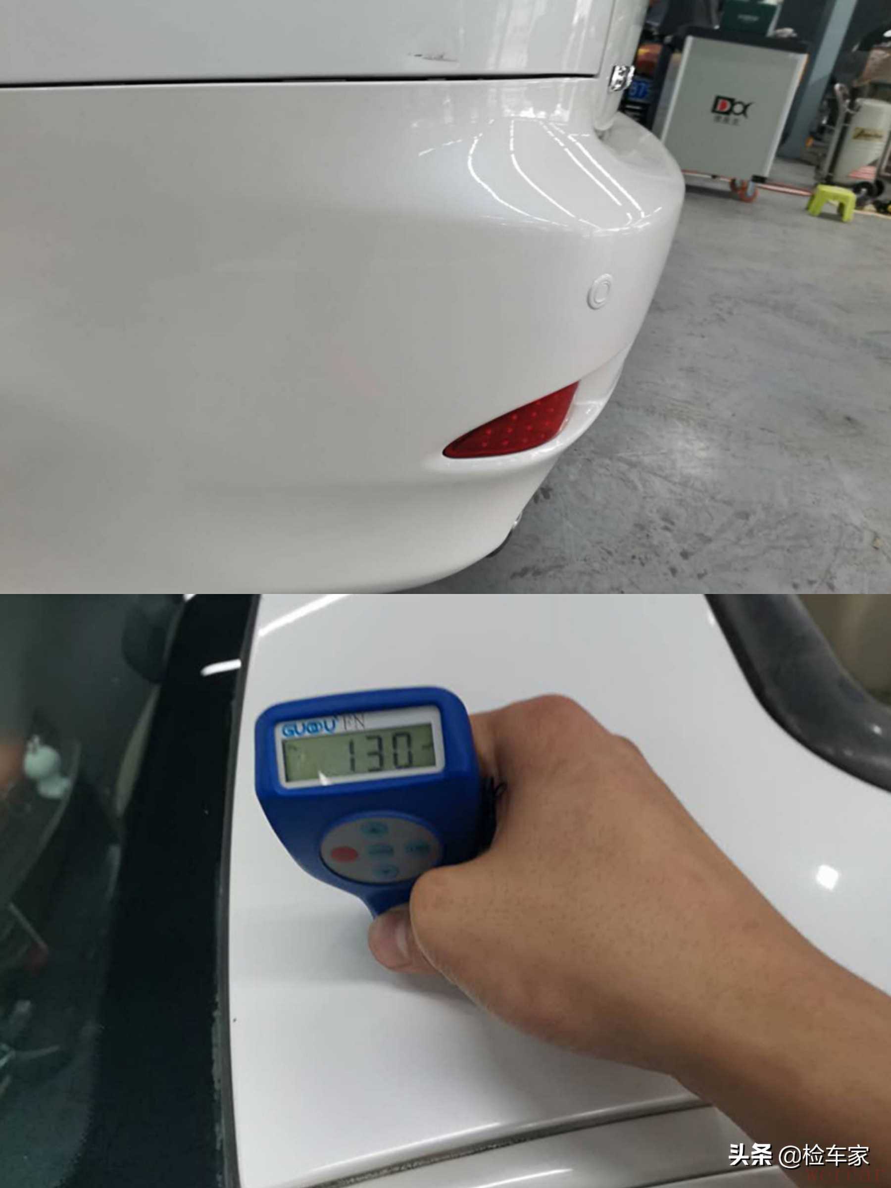 后保险杠有明显的色差存在,车顶部分数值相对正常,但漆面瑕疵脏点过多,原车漆面做工是不会这么差的,所以可以确定后保险杠和车顶都有过喷漆现象。