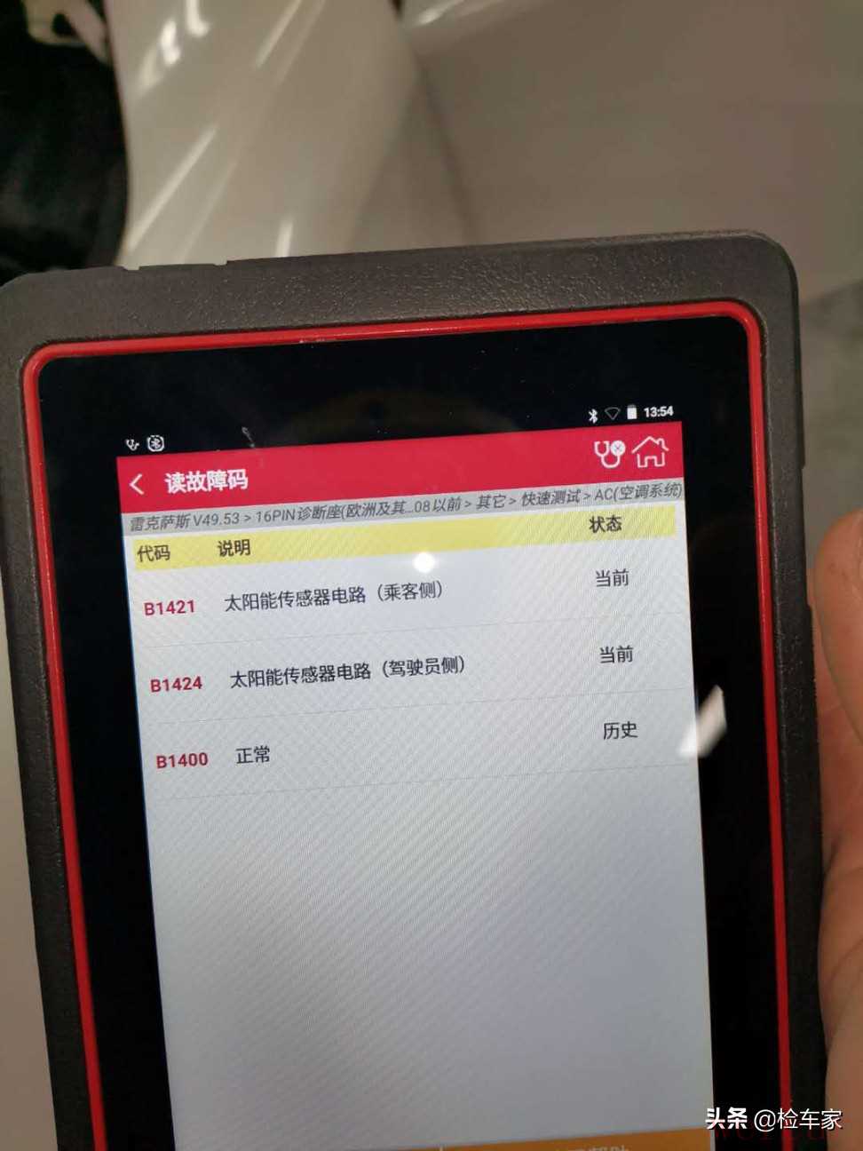 接下来就是功能性检测了,电脑OBD存在故障,显示是太阳能传感器电路故障,需及时处理。其设定条件为当光线暗到一定程度时设定,太阳能传感器装于前挡风玻璃下面的仪表台上,主要由光电二极管组成,其功能为检测日照强度,用它传出的电压信号来控制自动空属调和自动灯光,用拖灯照射太阳能传感器。