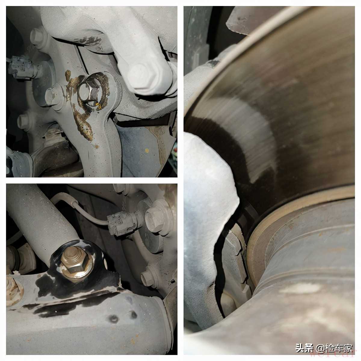 4.底盘:发动机一处轻微渗油,排气管轻微变形,四条轮胎不同程度老化磨损。