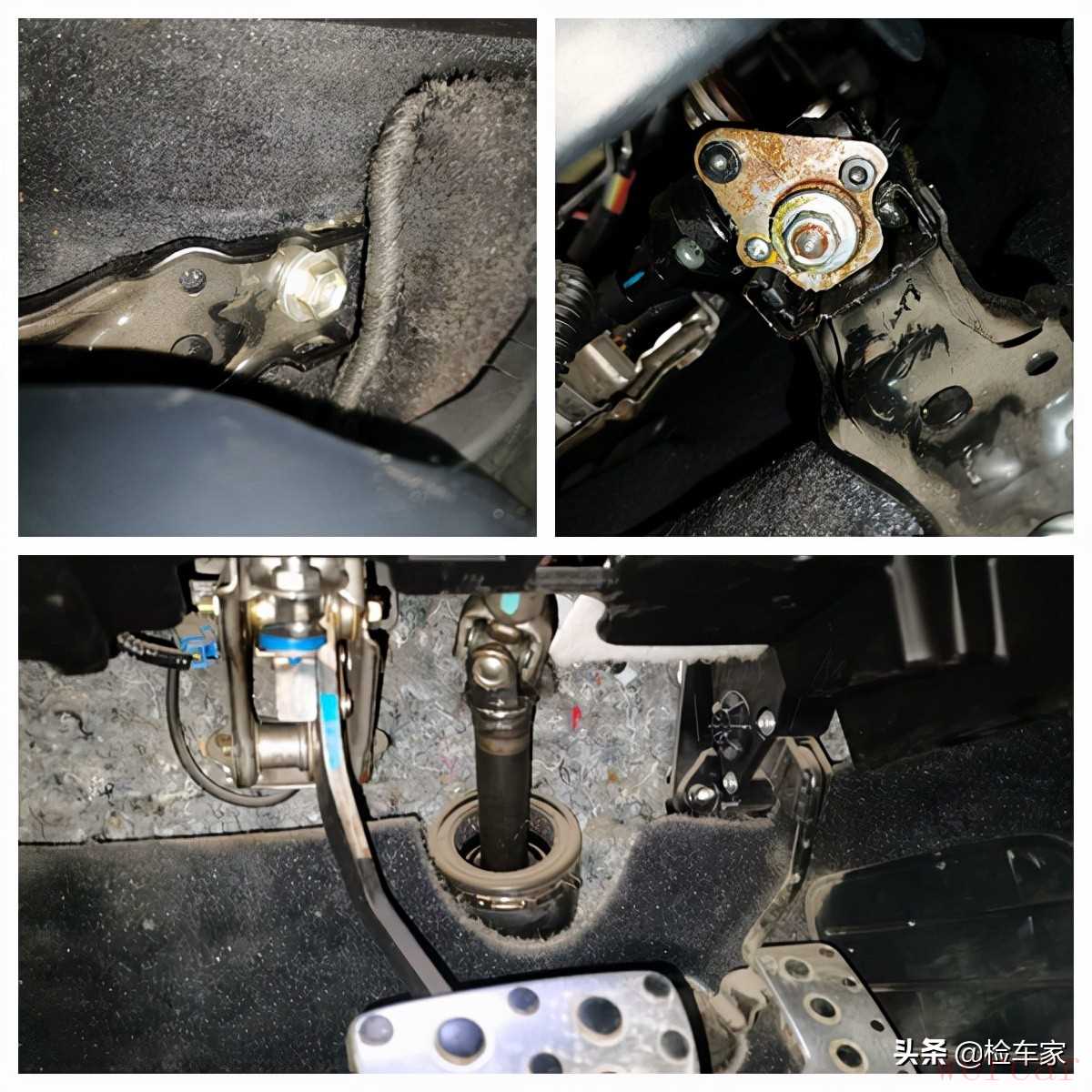 主副座椅均无拆卸,座椅骨架表面有些浮锈,没什么影响;方向管柱和刹车踏板都正常,地毯干爽无发霉发硬,综合判断,此车不存在泡水的情况。