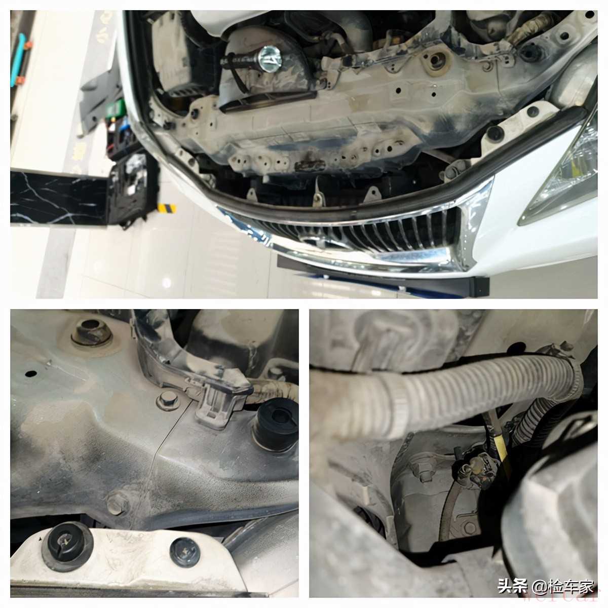 为了能看到内部的细节,三杠需要拆掉一些饰板,卖家也是非常配合,直言随便拆,好车不怕看!拆掉饰板以后,能很清楚地判断,大灯、水箱框架、前防撞梁、纵梁都没有拆卸维修更换的情况,基本可以判定,车头没有事故。
