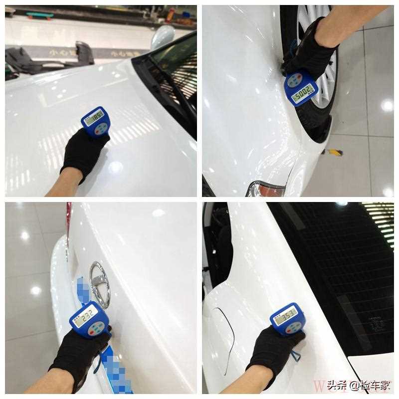 远看就知道是个全车漆,并不是三杠有多神,而是因为这样的老车总会留下岁月的痕迹,特别是白色的车漆,就是漆面会偏黄,大家可以多留意身边上了年限的白色车,多多少少都会有点儿偏黄。下面就开始检测,看看三杠说得对不对。