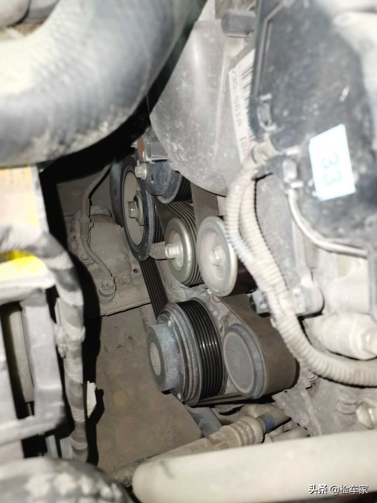 除了事故水泡,发动机变速箱也是客户比较关注和在意的地方,那么我们就来检查一下。首先还是查看发动机前端盖,可以看到螺丝都没有动过,也没有渗油漏油。