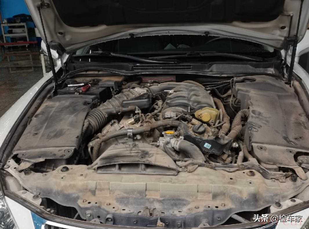 一打开机盖就能看到这台饱满的V6发动机和加装的防倾杆,这也许就是客户大哥为什么这么喜欢这辆车的原因。当时这台V6发动机最大马力231,最大扭矩300N·m,匹配6AT变速箱,百公里加速7.7秒。对于雷车来说,还是算比较快的了,而且用的是独立双叉式悬架带横向稳定杆前悬加多连杆后悬,过弯的稳定性在当时绝对是首屈一指,操控也是没得说。下面来仔细看看发动机情况。