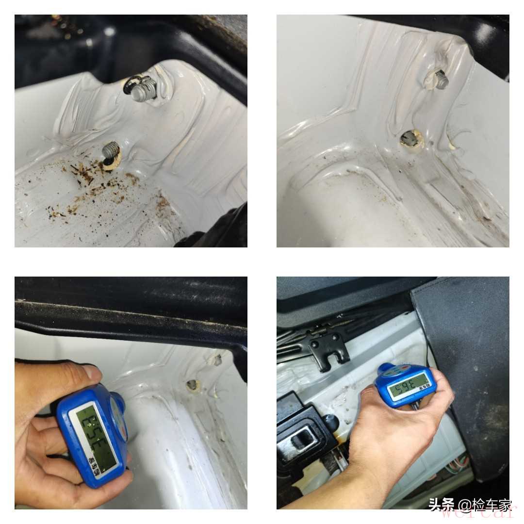 前面检查到后备箱有局部的钣金喷漆,所以现在来看看内部的情况,可以看到备胎槽的胶和漆面数值都没问题,所以判断后面发生的小追尾也不严重。外观整体看来还行,没有大的问题,钣金的位置也不多,就是和卖家描述不太相符。先记下来吧,下面检查发动机舱。