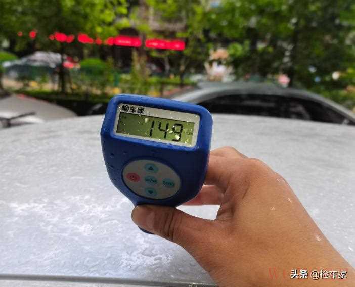 首先还是老规矩从车顶取一个外观的基础数值,得知外观漆面的基础数值在150微米左右。由于这款车的车漆有点不一样,看着是白色,但其实这款车的颜色是蓝色,想不到吧?在地下室明显能感受到变色龙的感觉,所以漆面数值比想象中的日系车偏高不少。
