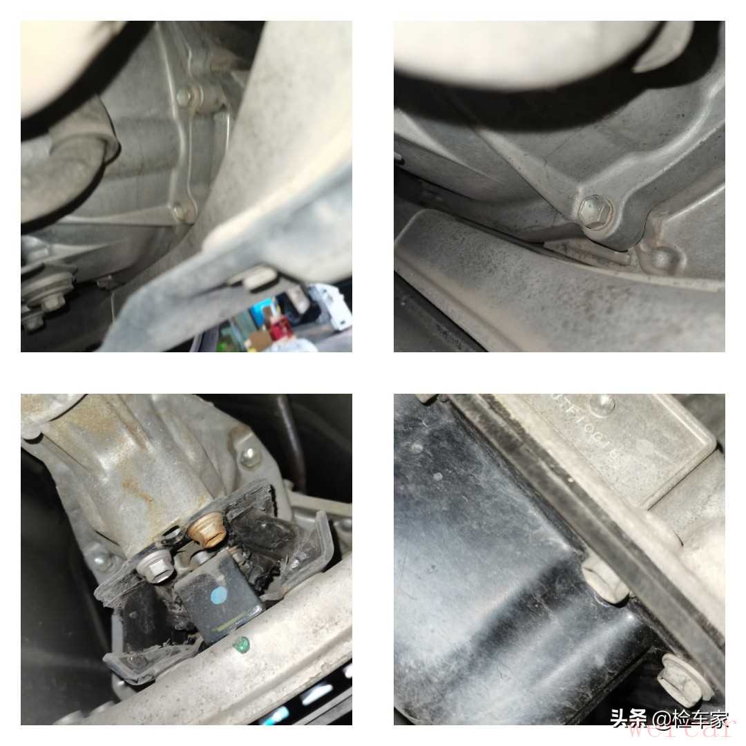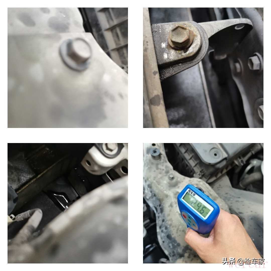 然后仔细看了前面的保险杠的螺丝有拆装的痕迹,水箱框架和防撞梁的螺丝都没有拆装的痕迹,而两个大灯拆装的原因可能4S店喷漆要求很高,所以要拆两边的纵梁。并且两边翼子板只是有局部喷漆,所以判断前面发生的应该是小刮蹭。