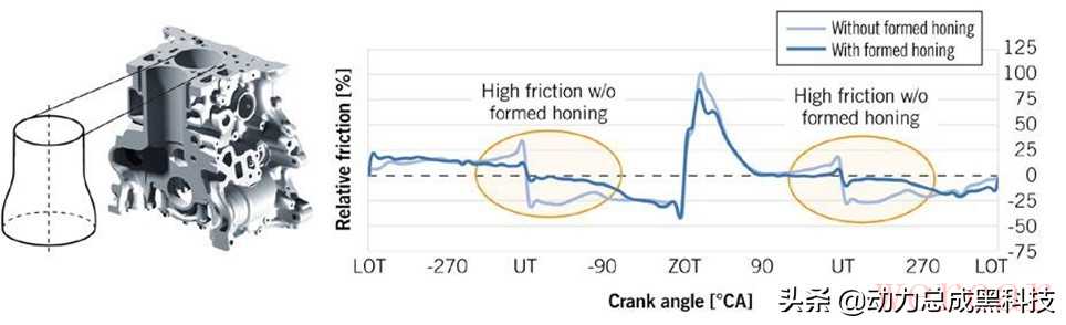 然而,由于燃烧室燃烧热量的不均匀,气缸壁温度随高度变化。由于热应力应变的影响,气缸壁的直径存在变形,这对活塞间隙有重大影响。由于热膨胀,活塞肯定直径变大,而气缸上部直径也会变大,但下部直径会相对变小。因此,即使采用了全铝制曲轴箱和铝制活塞的组合,在发动机中也可能出现活塞直径大于气缸壁直径的情况。由于这种影响,活塞运行中的摩擦阻力增加了。宝马通过热力学仿真和试验验证,通过旋转对称珩磨成型工艺,将气缸壁下部进行适当的拓宽,如图12左边所示。该措施有效地抑制了气缸下部直径小于活塞直径的风险,且无需承担增加活塞间隙的NVH和机械风险。图12右边显示了气缸壁与活塞摩擦阻力的曲线对比,效果显著。