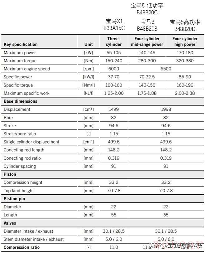 详细的发动机参数与应用技术如图2所示。B38为宝马X1上使用,B48低功率版本搭载在宝马3系,5系上,高功率版本搭载在宝马5系甚至7系上面。