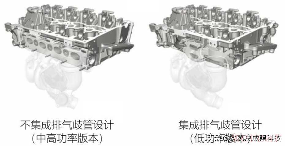 2、高低功率版本采用两种不同的缸盖。(低功率版本采用歧管集成式缸盖,高功率版本则是独立排气歧管)
