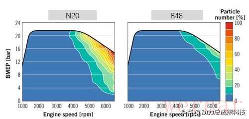 通过分流式冷却,直喷喷射压力升高和气缸壁温度升高等手段,降低了整个发动机工况图中的PN排放。图18以N20和B48发动机为例,展示了他们的区别。在最大发动机输出功率区域,B48的PN排放减少了2至3倍。