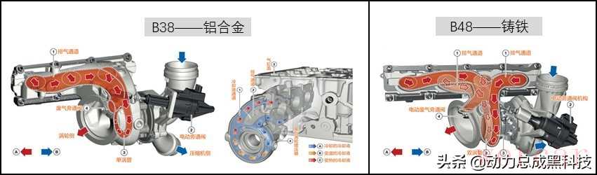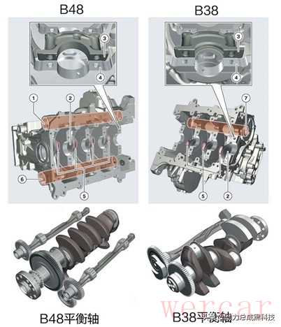 另外,B系列发动机也配有平衡轴,由于气缸数的不同,曲轴箱的作用力类型也不同,B48使用了双平衡轴,B38使用了单平衡轴。