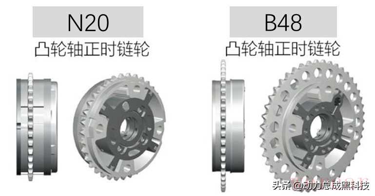 如图5所示,取消中间轮设计,让正时链条从两根变成一根,是B系列发动机的一个较大的结构改进。当然,也因为中间轮的取消,凸轮轴正时链轮齿比和齿距也要进行相应调整(如图6),保证凸轮轴与正时调节可以正常工作。另外,正时链条由两根减少成一根,其链条张紧器相应地也会减少一个,这样一来在可靠性方面会获得一定提升,且成本得到了降低。
