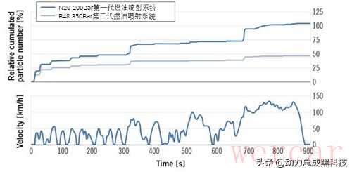 图19显示了WLTP循环中的累积PN排放。此外,在瞬态运行中,减少喷雾穿透性和由此产生的较少的壁面燃油附着对于减少PN排放至关重要。与N20发动机的200bar燃油喷射系统相比,采用350bar系统的B48发动机累积PN数减少了50%以上。更进一步, B48发动机能够满足未来RAD测试法规要求。