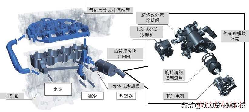 图7 带分流式冷却阀的发动机内部冷却回路(左)和热管理模块(右)的设计