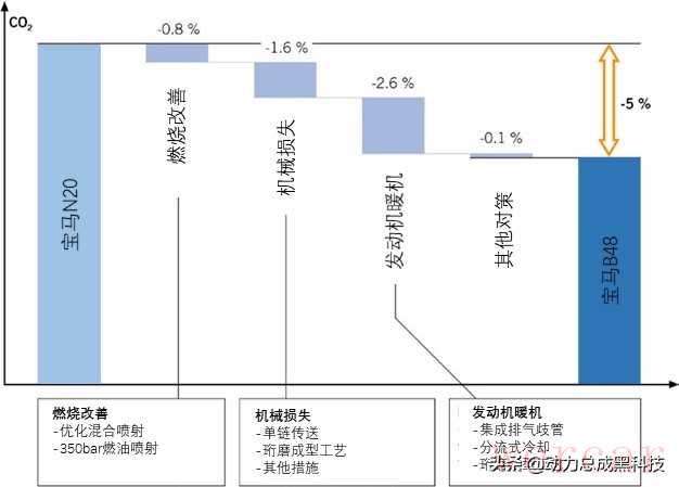 解决发动机暖机、机械阻力和热管理问题之后,发动机的油耗有所降低。图20显示了各个措施对总体油耗降低的贡献。以B48低功率发动机为例,宝马3系在NEDC工况下CO2排放降低了5%。
