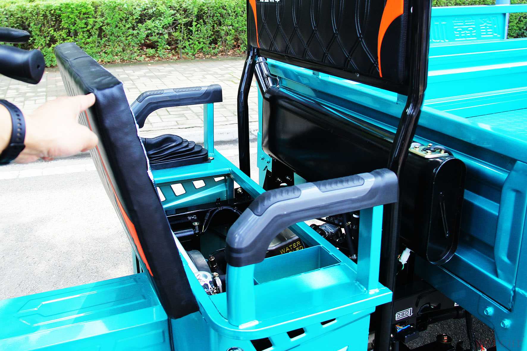 车座融入了人体工程设计理念,超级暖心。宽大的一体式车座,加厚海绵坐垫,辅之软质回弹性好的大靠背,驾乘舒适感倍棒。车座可翻转式结构,与发动机系统以及水冷系统直接联通,设计精巧,简化了车辆的保养流程,并在一定程度上确保了车辆更高的出勤效率。