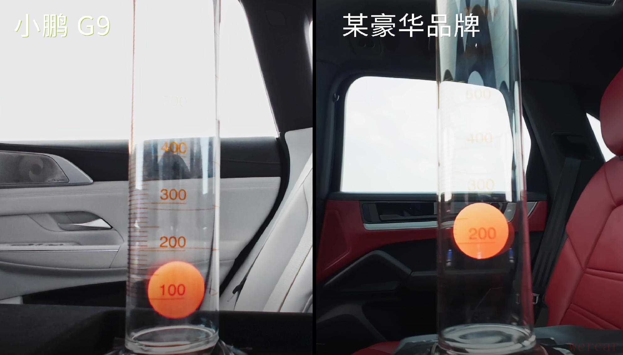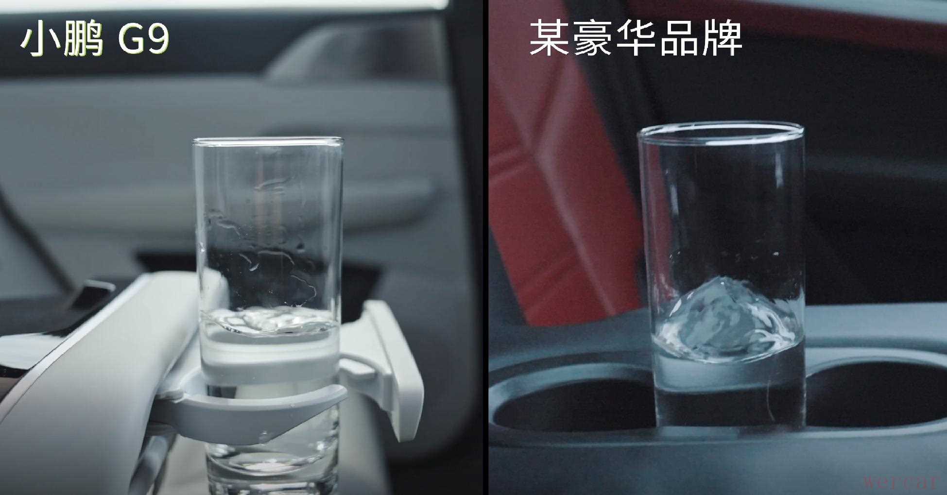 车辆内放置了水杯,在整个的测试过程中,小鹏G9的水杯波动更小。