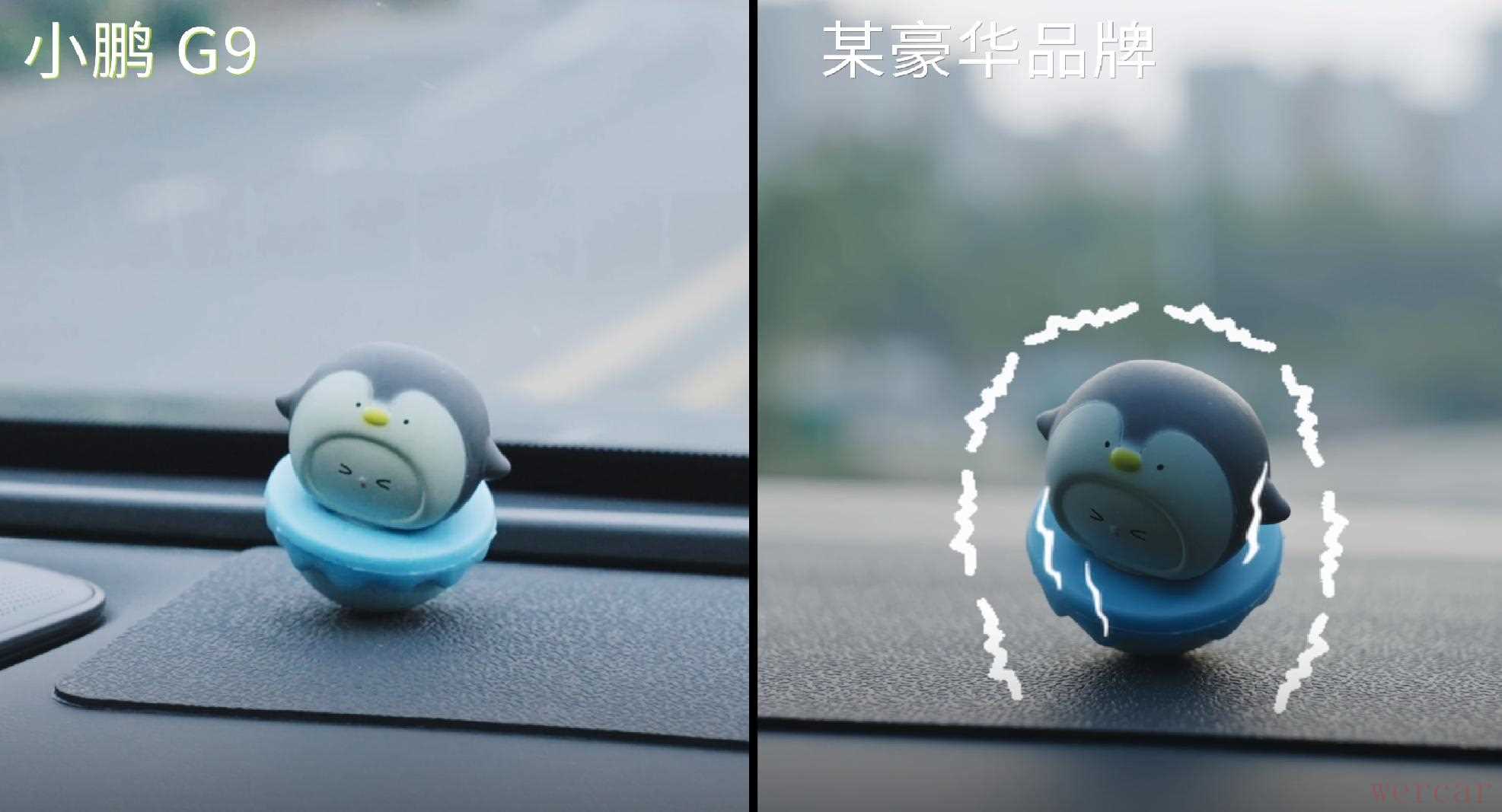 通过视频中不倒翁的摇晃和滑动玩具滑动程度可以看出,小鹏G9的晃动程度更低。