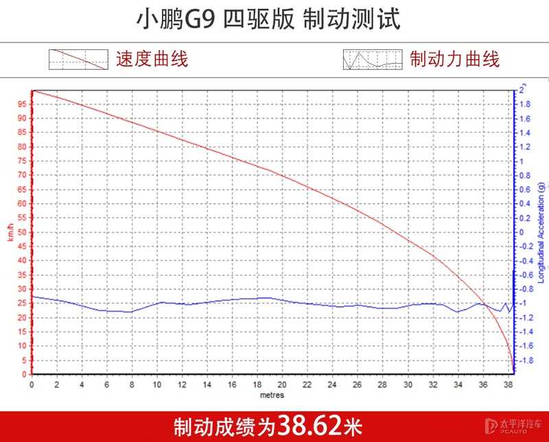 四驱版相比两驱版车型整备质量多了130kg,实测下来100-0km/h制动测试距离为38.62米,相比两驱版车型的制动距离要长一点,不过在制动制动的过程当中,车身点头现象并不算明显。