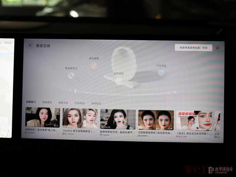 当然,副驾的女王也要好好对待她,副驾屏幕内置了一个美妆空间,除了有专属的化妆座椅调节外,屏幕下方还有一堆美妆教学视频,小鹏G9是真的会玩。