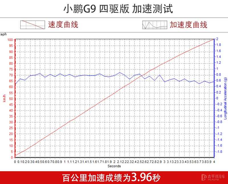 在70km/h之前,整个加速过程除了起步那一瞬间基本都能保持0.8g的加速度,甚至在时速达到100km/h时,也能拥有接近0.6g的加速快感,但因为四轮驱动的缘故,加速测试时轮胎也没有明显滑动,最终四驱版车型跑出了3.96秒的0-100km/h加速成绩,实测和官方宣称的一样,的确是一辆3秒级加速的SUV。