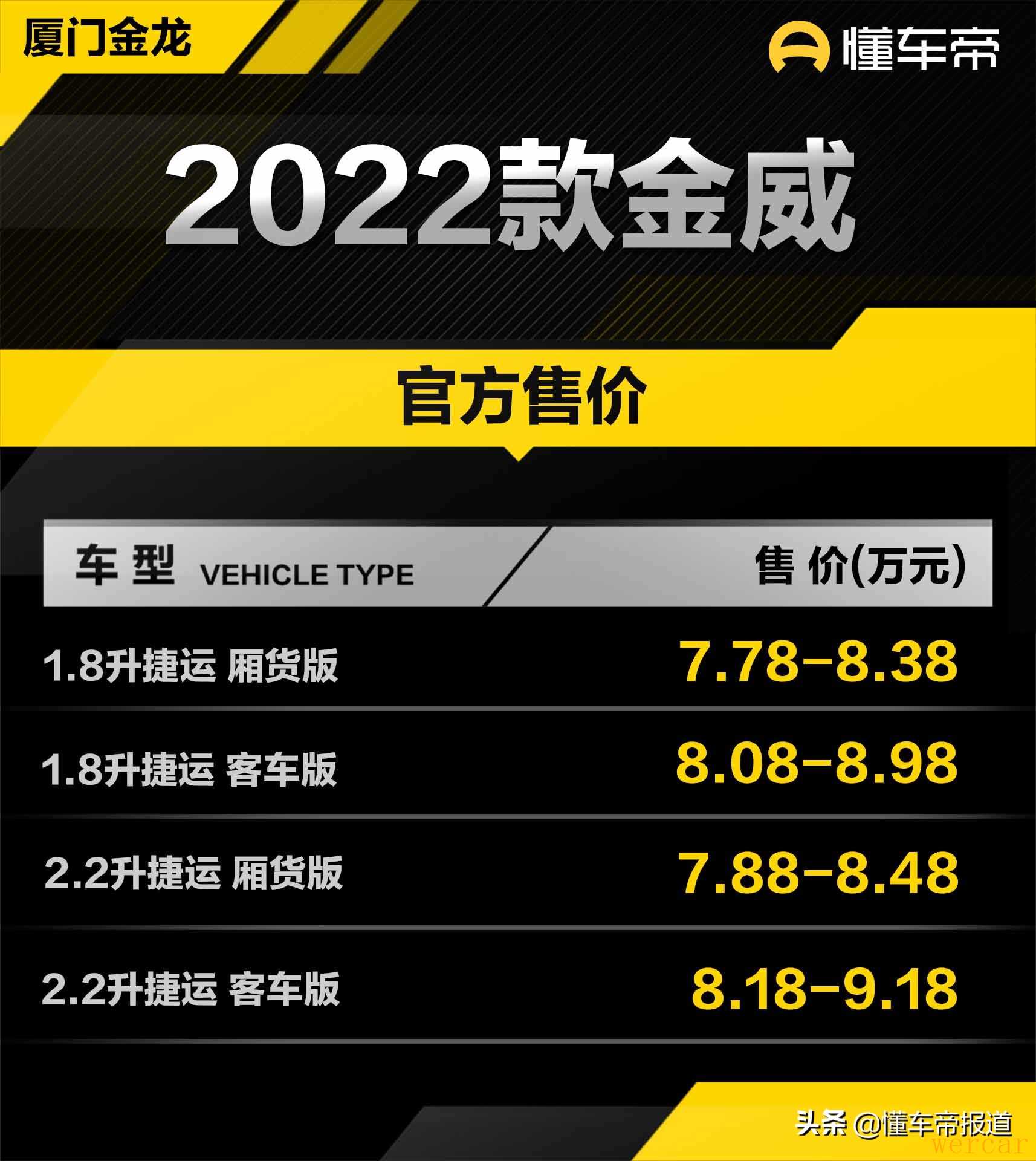 对比2021款车型来看,2022款金威全系取消商务型中顶和高顶车型,并且除商务型以外,部分车型售价有所上涨。其中,1.8升捷运厢货版除商务型外价格上涨4000元;2.2升捷运厢货版除商务型外价格上涨3000元;1.8升捷运客车版除商务型外价格上涨1000元;2.2升捷运客车版售价未变。