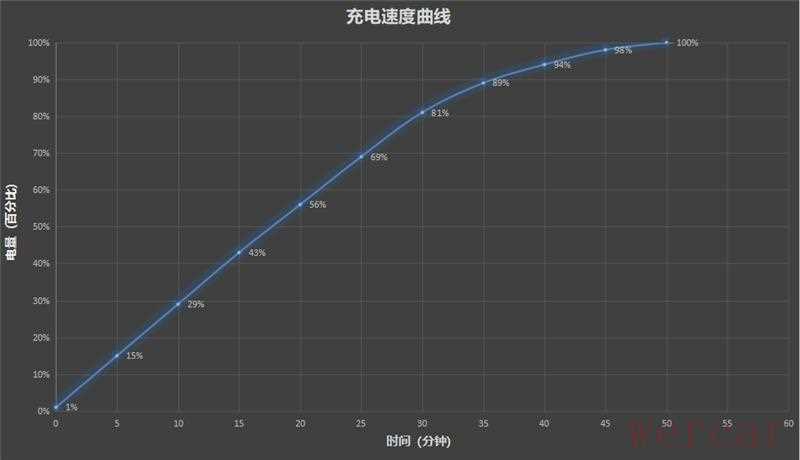5分钟充电15%,10分钟充入29%,20分钟充入56%,半小时充入81%,最终充满用时50分钟。