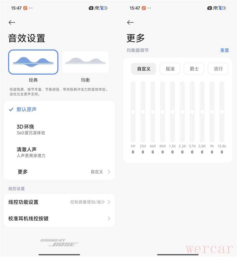 BOSE均衡:则是与经典模式互补,三频均衡,提供更平滑的频响曲线。