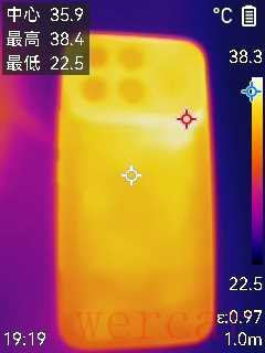 背部最高温度为38.4度,与手机中心差距2.5度。