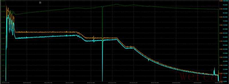 在第二分钟开始回归稳定,固定到53W后随着电压上升逐渐提高,持续到17分钟到达57W。